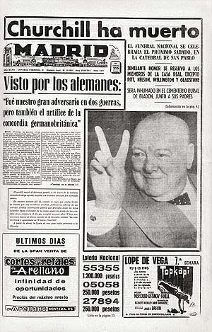 Churchill fue elegido para presidir un gabinete de concentración nacional justo antes que empezara la Batalla de Inglaterra. Fue entre las ruinas de las ciudades devastadas por las bombas cuando se forjó su leyenda. En las horas más bajas de la guerra, cuando la Gran Bretaña luchaba prácticamente sola contra los nazis, hizo honor a su promesa de ofrecer “sangre, sudor y lágrimas” y se convirtió así en el símbolo de la determinación y el orgullo británicos. Cuando el signo de la guerra cambió se hizo un lugar entre las dos grandes potencias mundiales que se repartían el mundo. En 1945 fue derrotado en las urnas por los laboristas, pero seis años después consiguió un segundo mandato. En 1953 ganó el premio Nobel de literatura. Ejemplos de esta efeméride en nuestra prensa española podemos ver los ejemplares de los periódicos "Madrid" y "ABC". El primero está fechado el 25 de enero de 1965 mientras que el segundo, debido a que los lunes no salía edición, es del día 26 siguiente.